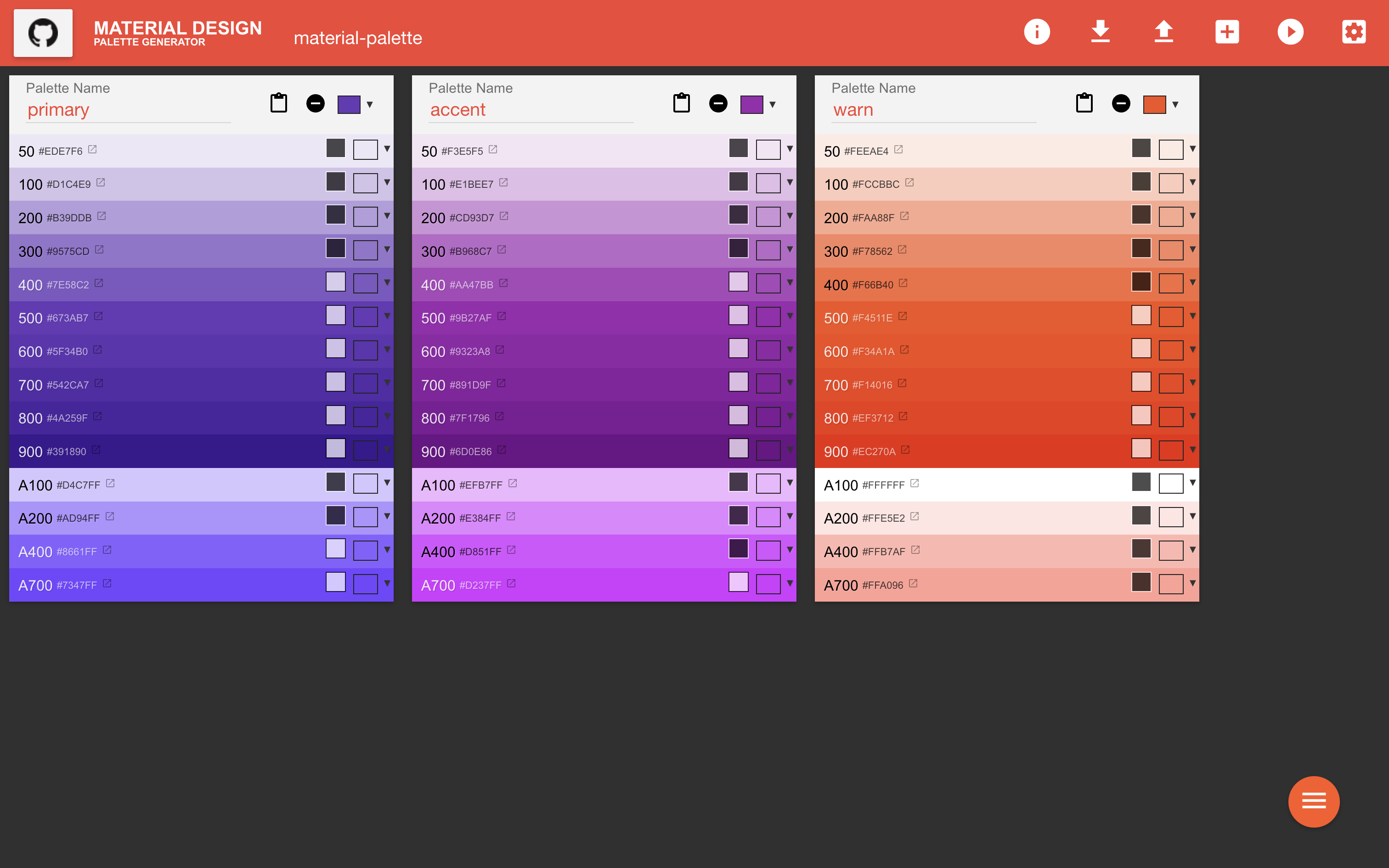 With the palette above: (primary: #673ab7, secondary: #9b27af, and a warn color value of #f4511e), we can use an open source tool called Material Design Palette generator to generate hues of 50 and then each 100 between 100 and 900 without having to do this manually.